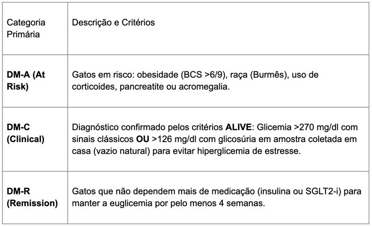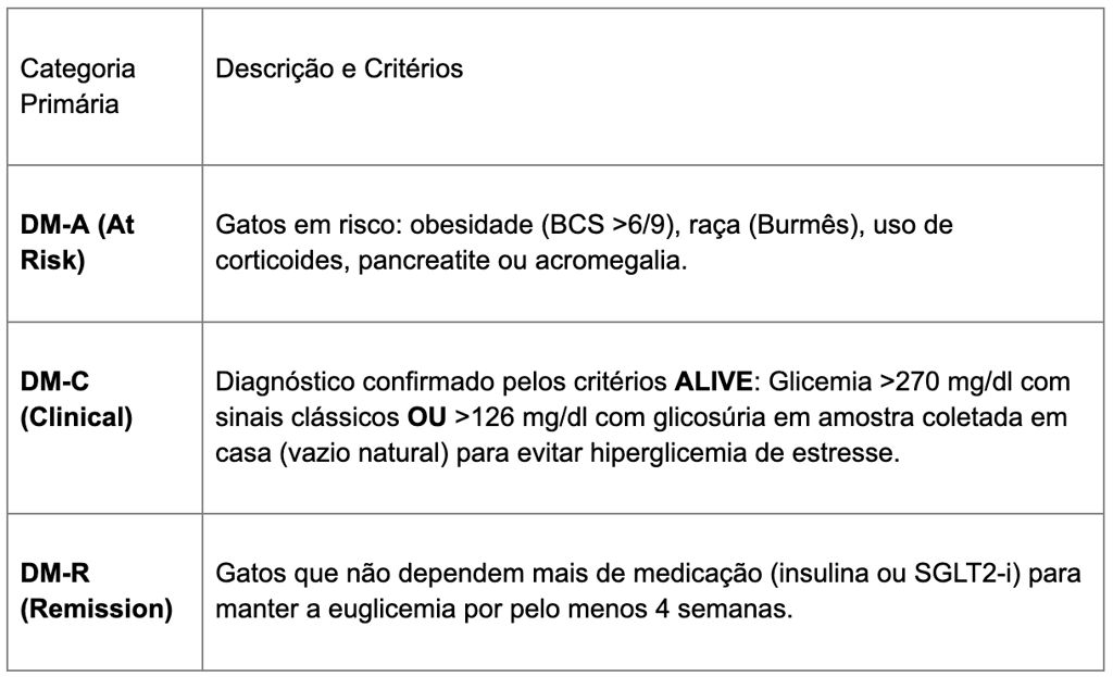 Uma das maiores inovações das novas diretrizes é o sistema de classificação que permite uma visão 360° do paciente. Em vez de rotular o gato apenas como "diabético", agora utilizamos dimensões primárias e subsidiárias para guiar a conduta