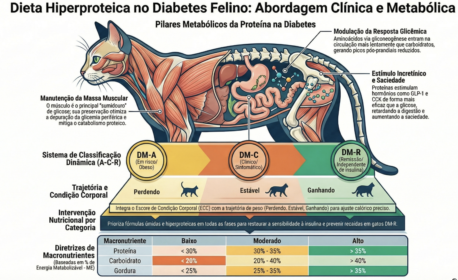 O consenso recomenda dietas de alta proteína (>100g/Mcal) não apenas para preservação muscular, mas por um "segredo metabólico": em gatos, os aminoácidos da digestão proteica são mais eficazes que a própria glicose em potenciar a secreção de insulina estimulada pela glicose e estimular fatores enteroendócrinos (incretinas como GLP-1 e GIP). Esses hormônios retardam a digestão e aumentam a saciedade, tornando a proteína a ferramenta metabólica mais poderosa no manejo felino.