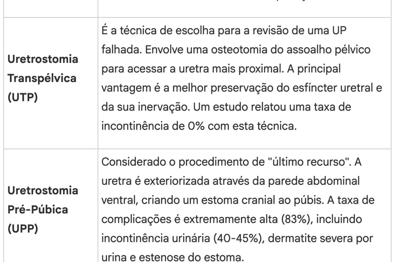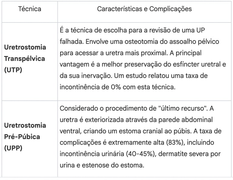 Nos casos em que a Uretrostomia Perineal falha ou quando não há tecido uretral pélvico suficiente, procedimentos de salvamento mais complexos são necessários.