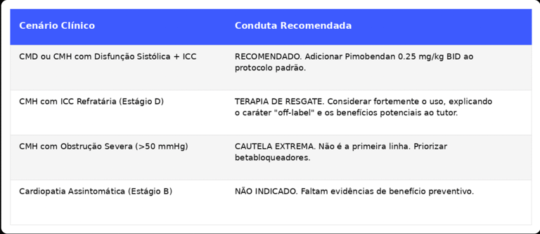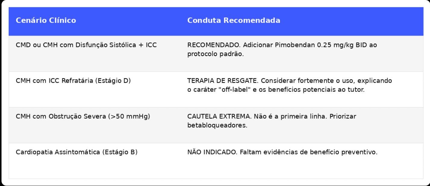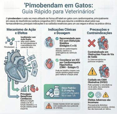 A Conclusão Prática: O medo de uma catástrofe hemodinâmica ao usar pimobendan em um gato com CMH e obstrução leve a moderada é, na maioria das vezes, infundado. A evidência sugere que o benefício do suporte inotrópico supera o risco na maioria dos pacientes com ICC. A cautela ainda é mandatória em casos de obstrução severa basal, onde betabloqueadores como o atenolol ainda são a primeira linha.